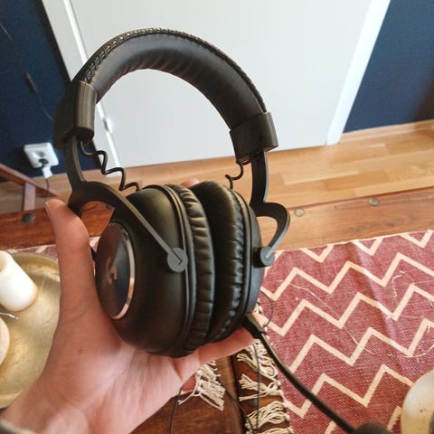 Selger Logitech gaming-headset med mikrofon. Headsettet fungerer som det skal og har god lyd, men øreputer og polstring i hodebøylen er slitt (se bilder).