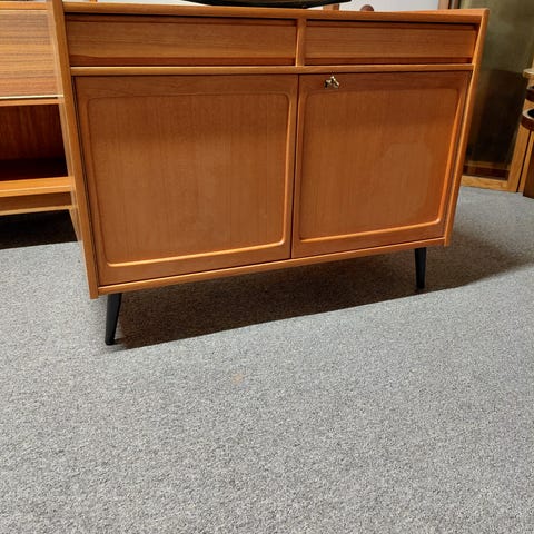 Praktisk teak kommode med fire skuffer. Godt ivaretatt. Noen merker er å finne.