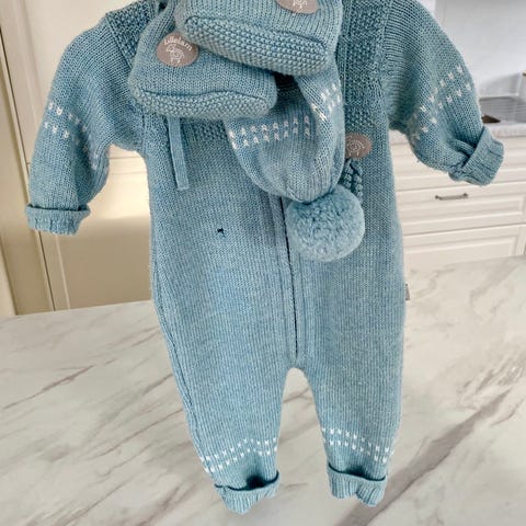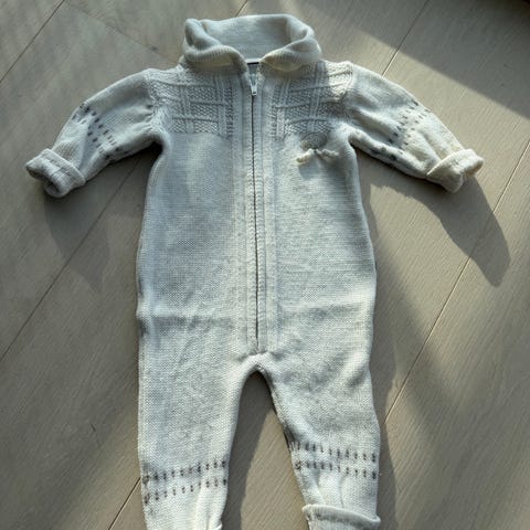 Lillelam ulldress sett for baby i størrelse 56. Sett i blå ull som består av heldress, lue, votter og tøfler. Nypris er 2200. Veldig pent brukt. Ingen slitasje.