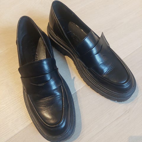 LÄST Skinnloafers i størrelse 39. Skoene er i svart skinn med kraftig, riflet gummisåle og markert søm rundt sålekanten. Klassisk loafer-design med overlappende rem over vristen. Passer til hverdagsbruk og mer formelle anledninger .