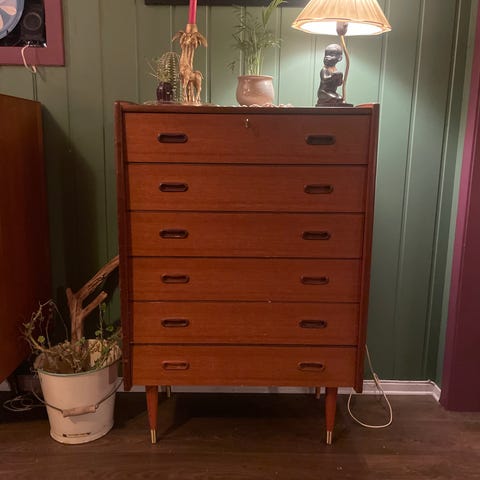 Unik retro kommode i teak selges – profesjonelt restaurert med stor presisjon og sans for detaljer. Møbelet har gjennomgått full oppfriskning og er nymalt i en dyp, elegant grønnfarge med jevn finish av høy kvalitet. Resultatet er et eksklusivt møbel som kombinerer klassisk håndverk med moderne uttrykk.