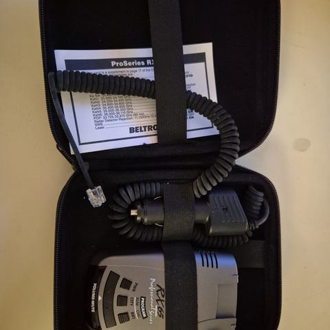 Selger en radar detektor som har ligget i skuffen mange år. Pluggen på powerledningen er loddet og festet til selve detektoren.