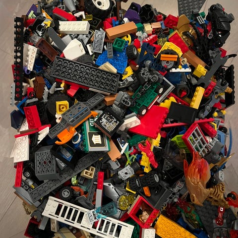 LEGO klosser og plater i blandet lot. Inneholder ulike typer klosser, baseplater og deler i flere farger og størrelser, slik som standard klosser, spesialdeler.