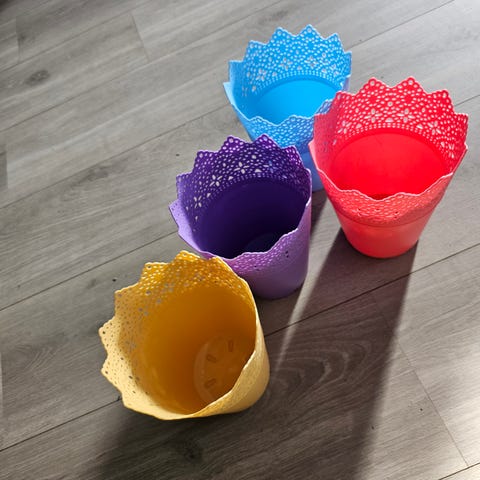 Blomsterformede plastpotter flerfarget sett