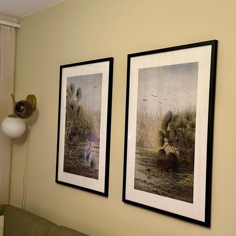 Den ene plakaten viser en fargerik hjort i abstrakt stil, den andre et fjellandskap med blomstrende kirsebær trær.