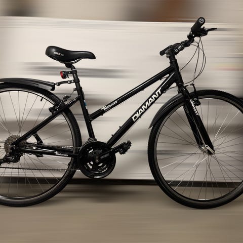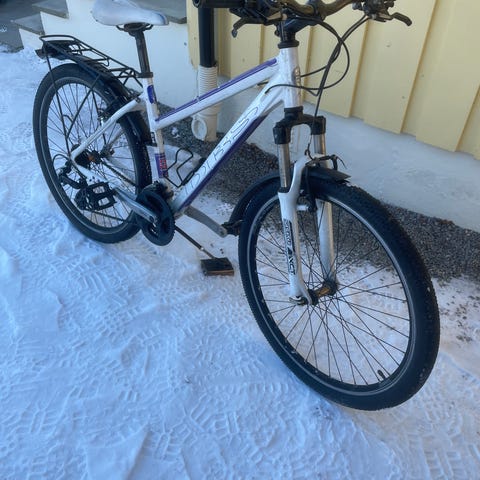 Sykkel med alle typer av utstyr på. Bagasjebrett, lys, flaskeholder, skjermer mm. Giret trenger en justering, eller fungerer alt fint.