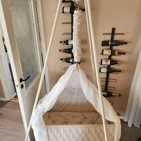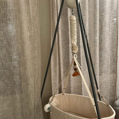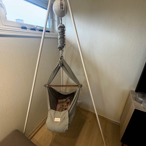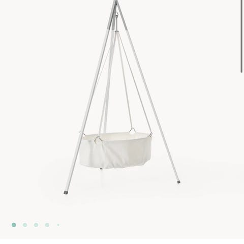 Moonboon oval hengevugge med tilhørende madrass, formsydd laken, "heaven" sengehimmel og madrass fixi. Kjøpt for 4750kr sommeren '25 og brukt sparsomt til ett barn (som ikke ble helt komfortabel i vuggen). Selges samlet og er delvis montert.