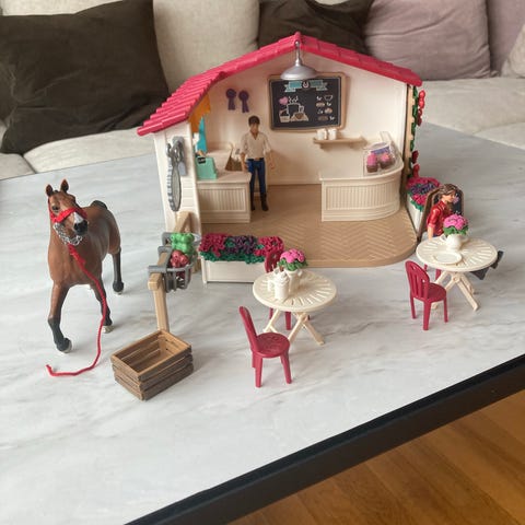 Settet inneholder rød bil med takmontert campingtelt og stige, hestehenger med trykk av ryttere, hestefigur, to menneskefigurer, soveposer og diverse små tilbehør som kurver og utstyr. Lekesettet er egnet for rollelek med tema camping, ridning og reiser.