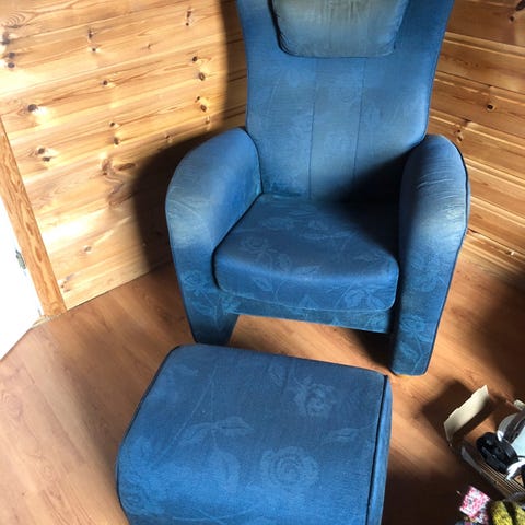 Godt brukt lenestol gis bort ved henting. Funker som den skal funksjonelt og er fortsatt god å sitte i, men mtp flytting har den ikke lenger plass. Har noen slitasjer her og der, og et lite hull på siden som lett kan tettes.