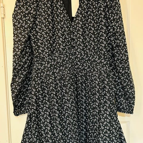 Nydelig kjole fra Camilla Phil. Modellen har vide ermer med lett puff og broderte detaljer øverst på bryst og ermer. Den har krage og v-utringning uten knapper, samt innsvinget liv og utsvingt skjørt som går til over kneet. Passer som hverdagskjole eller til enkle anledninger.