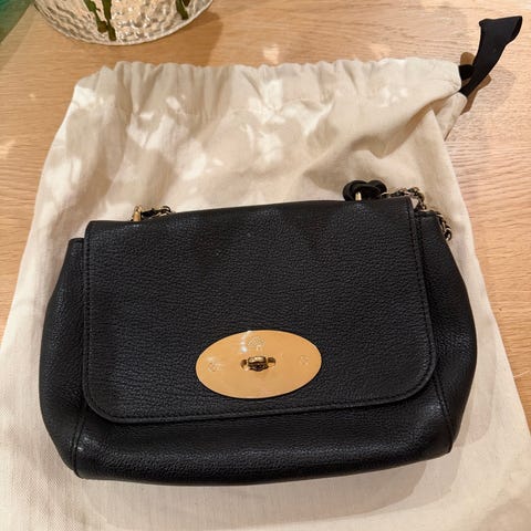 Vesken har klaff med karakteristisk Mulberry-lås i metall og lang skulderrem i gullfarget kjede.