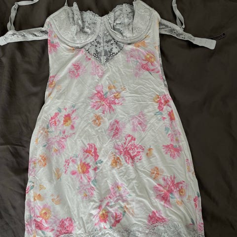 Pent og lite brukt kjole i japansk-inspirert stil med vakkert blomstermønster og dyp splitt selges; den har delikate perledetaljer på ryggen og passer perfekt som både nattkjole eller til spesielle anledninger.