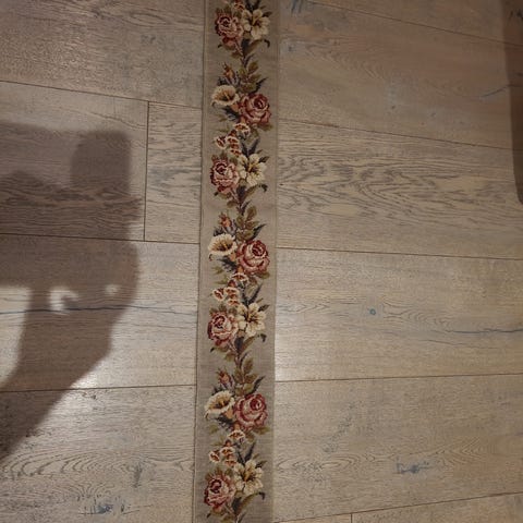 Håndlaget brodert klokkestreng med fargerikt blomstermotiv i petit point med beslag.