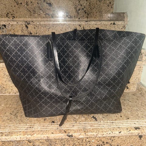 By Malene Birger toteveske med det karakteristisk mønsterdret og doble skulderstropper i kontrastfarge. Den ene reimen er blitt litt ødelagt men det kan enkelt fikses hos en skomaker/skredder. Ellers er vesken hel og pen. Innvendig følger det med en mindre clutch/pouch i samme mønster som kan festes i vesken om man ønsker eller brukes separat. Vesken er rommer mye og er perfekt til jobb/skole. Egnet til hverdagsbruk med plass til personlige eiendeler som lommebok, nøkler og småting.