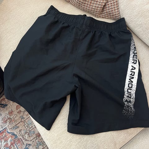 Under Armour treningsshorts for herre i størrelse M. Shortsen er svart med oransje Under Armour-logo og trykk langs siden. Elastisk linning med snøring for justerbar passform.