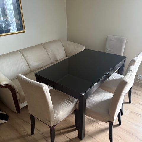 Spisebord med 2 ileggsplater og 6 stoler