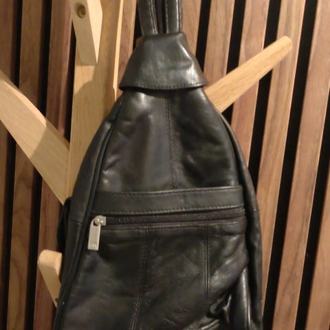 I brunt skinn.praktisk og god plass med 2 lommer foran og 1 inni. Vises brukt som en skinnransel skal være..