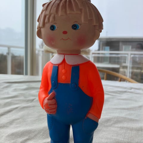 TITTEN TEI ANDRE VON DREI FIGUR.Figur i plast med rød og hvit stripet genser, blå shorts og brune sko. Størrelsen er liten og passer i hånden, egnet som leke, samleobjekt eller pynt. Fargene er klare med detaljer i ansikt og hår. Figuren står på flate såler, som vist på bildene.Norsk produsert herico ca 1974.ca 14 cm.