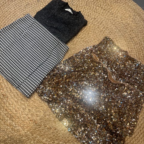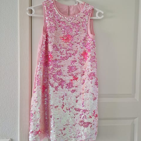 • Festkjole fra Lindex (str. 146): En nydelig rosa kjole med gullfargede paljetter på overdelen. Skjørtet er av lett tyll med små paljetter som glitrer fint. Kjolen har regulerbare stropper og strikk i ryggen, som gjør at den sitter veldig fint på.