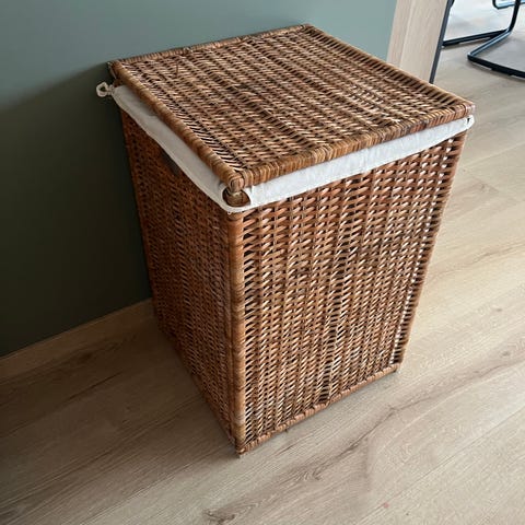 Kurv til oppbevaring i flettet materiale i brun farge. Kurven har lokk og håndtak som gjør den enkel å flytte. Egner seg til oppbevaring av for eksempel skittentøy, tepper eller andre tekstiler i hjemmet.