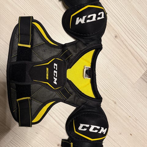 CCM Tacks skulderbeskyttelse for ishockey til barn i størrelse medium. Modellen har polstrede skuldre og brystparti for beskyttelse under spill og trening på is. Yttermateriale i slitesterkt syntetisk materiale med innside i mykt tekstil i gul farge. Justerbare stropper rundt bryst og overarmer gjør det mulig å tilpasse passformen.