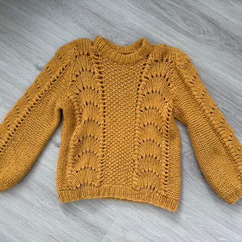Svært pent brukt, aldri vasket forutenom skylt opp som nystrikket. Strikket i 1 tråd merino fra kfo og 1 tråd silk mohair. Strikket av erfaren strikker og har ingen feil eller mangler. Nydelig hullmønster etter petite knit. Superfin over kjole.