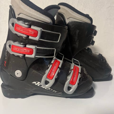Nordica alpinstøvler i størrelse 225 mm. Støvlene er svarte med røde og hvite detaljer og har fire justerbare spenner i plast/metall for god tilpasning rundt fot og legg. Passer til bruk med vanlige alpinbindinger. Egner seg til barn eller mindre føtter, avhengig av mål på fotlengde (260 mm sålelengde).