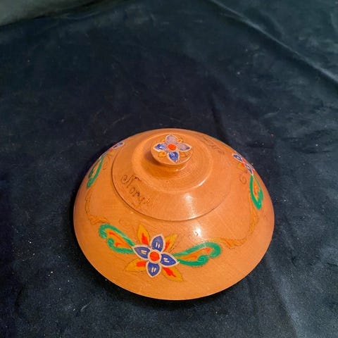 Vintage japansk dekorasjonssett med brett og tilhørende beholdere med malt landskapsmotiv. Settet består av et avlangt brett, en rund boks med lokk, en mindre beholder og en rund gjenstand som kan brukes som skål eller askebeger. Alle delene har matchende dekor med natur- og fjellmotiv i flere farger på mørk bakgrunn. Egnet som dekorasjon på bord, hylle eller kommode, eller som praktisk oppbevaring av småting.