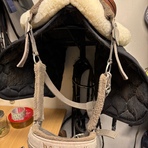 Flere justeringsmuligheter på remmer og gjorder for tilpasning til hesten.Læret fremstår som solid ,og i god stand.