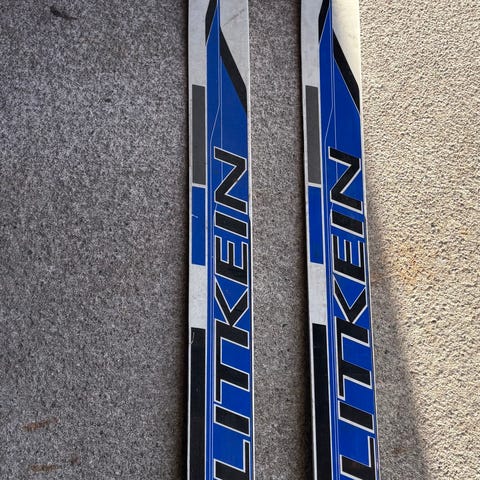 Splitkein i rød og hvit topp med blå såle. Ski beregnet for langrenn. Lenge 100cm, uten binding