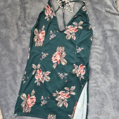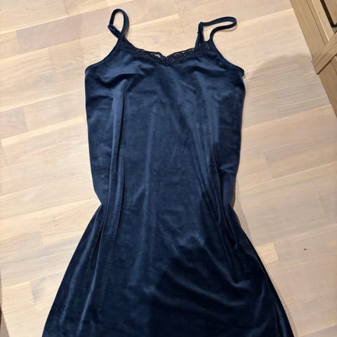 Nydelig nattkjole i silkemyk sateng med delikate blonder selges; den har en flatterende passform med knyting bak, er kun brukt til bilder og fremstår som helt ny.