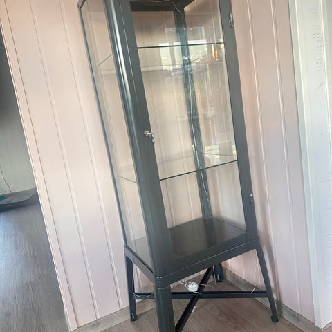 Malt skap. Glasskap 85 cm breitt. Hylle med list over. 130 cm