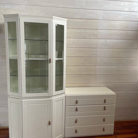 Møbler selgest grunna flytting. Pakken består av et hvitt vitrineskap med glassdører og åpne hyller, en svart skjenk med skapdører og skuffer, samt et hvitt skrivebord med skuffeseksjon. Møblene er i ulike farger og utførelser, og passer til bruk i stue eller spisestue, samt kontor eller soverom for skrivebordet.