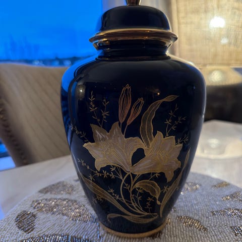 Denne er veldig fin dekoreret og som ny. Den har farven koboltblå og fra japan. Højde 13 cm med lok. Diameter 10cm.