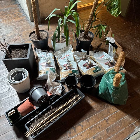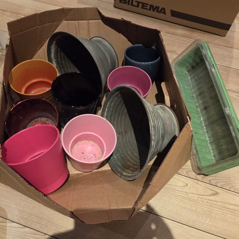 Samling med diverse planteutstyr og potter. Inneholder blant annet flere blomsterpotter i ulike størrelser, noen plastpotter, plantepinner/støtter, ledning til lampe eller vekstlys samt annet tilbehør til planter. Egnet for innendørs plantehold og ompotting. Innholdet selges samlet slik det fremstår på bildene.