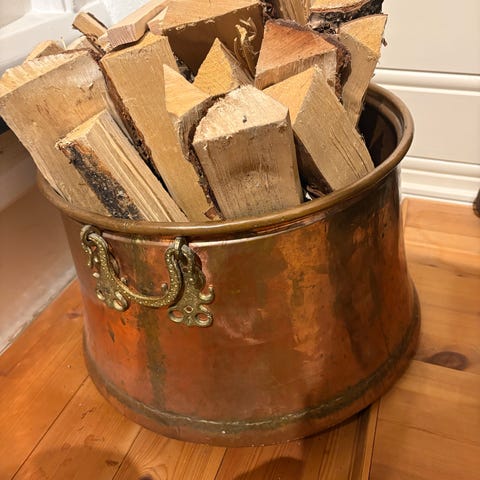 Kobbergryte med tre ben i smijern. Meget pen, men trenger en puss. Den er 33 cm høy og 45 cm lang, 33 cm dyp. Brukt til ved, men kan brukes til planter eller andre ting. Meget dekorativ med sin ovale form.