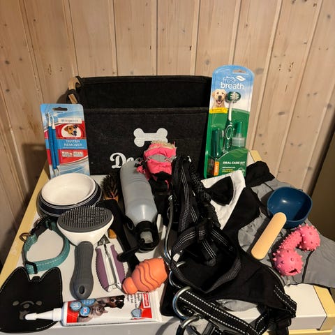 Pakke med blandet hundeutstyr og hundemat. Inneholder ulike typer tørrfôr, godbiter og snacks til hund nesten alt er av kylling og selges pga hund med allergi. Det er diverse utstyr som hundebånd, seler, matskåler, sko.. Flere størrelser og farger på utstyret. Men passer best til små hunder, hunden vår er toller på 18 kg og er for stor for alt.