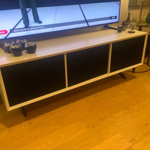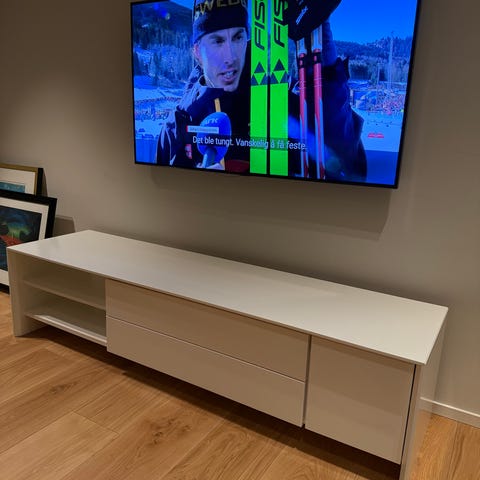 Kjempefin hvit TV benk i utmerket stand. Ingen synlige bruksmerker. Kan henges på vegg eller stå rett på gulv. Magnetisk åpning og lukking med et trykk. Hentes i Bjerkreim