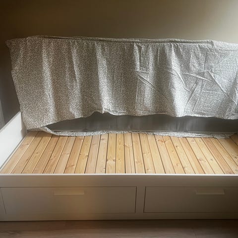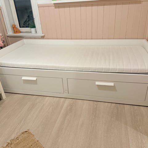 To madrasser følger med, som vist på bildene. Og sengen kan trekkes ut slik at den blir dobbel. Veldig kjekt for overnattingsbesøk!