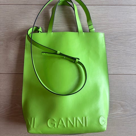 Ganni veske i 100% resirkulert skinn. Lite brukt, men litt slitasje i ytterste lag på hank/snor etter oppbevaring. Ellers ingen synlig slitasje eller merker. Se siste bilde. Justerbar skulderrem og lukkes med magnetknapp øverst.