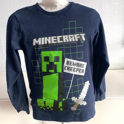 H&M Minecraft T-skjorte for gutt i størrelse 134. T-skjorten er blå og laget av bomull. Forsiden har trykk med Minecraft-figurer og tekst.