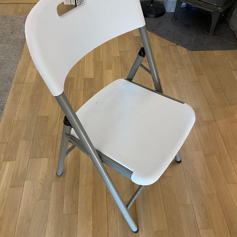 Leier ut 8 solide sammenleggbare stoler (5 hvite + 3 svarte).
