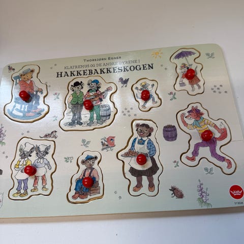 Helt nytt, uåpnet og forseglet. Thorbjørn Egner Hakkebakkeskogen puslespill i papp med motiver fra Klatremus og de andre dyrene i Hakkebakkeskogen. Esken inneholder to puslespill med 30 brikker hver. Puslespillene er laget i papp og er egnet for barn fra 3 år og oppover. Motivene viser karakterer og scener fra Hakkebakkeskogen-universet.