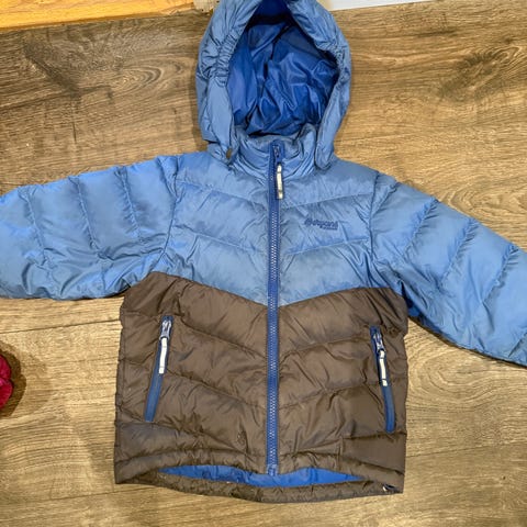 Bergans dunjakke str 98 selges. Hel jakke, uten hull (såvidt jeg klarer å se). Er noen flekker her og der, mulig de vil gå bort i vask. Se bilder. Ingenting som har å si for bruken.