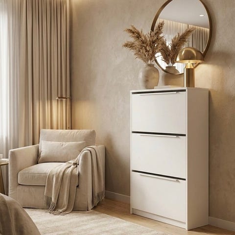 Praktisk og stilren skohylle / skoskap i lys trefarge med hvite fronter. Passer perfekt i gang, entré eller liten leilighet hvor man ønsker smart oppbevaring uten at det tar mye plass. Tidløst design som passer både moderne og klassisk interiør.