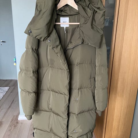 Fin dun kåpe med glidelås og knapper. Stor hette og godt dekke i hals.
