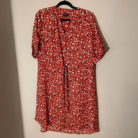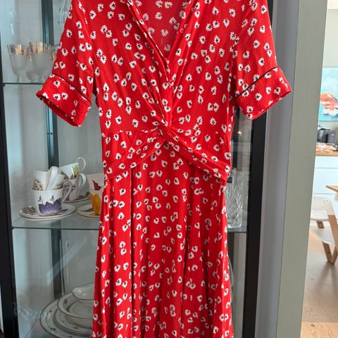 Nydelig sommerkjole i vintageinnspirert modell. En fresh rødfarge med prikker. Knapper hele veien og med lommer (selvfølgelig). Kjolen er i str XL. Men føles mer som en liten L.