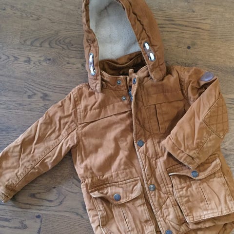 Fôret jakke fra Lindex i størrelse 98. Jakken er brun, har hette, flere lommer foran og glidelås. Innsiden er vattert for ekstra varme.