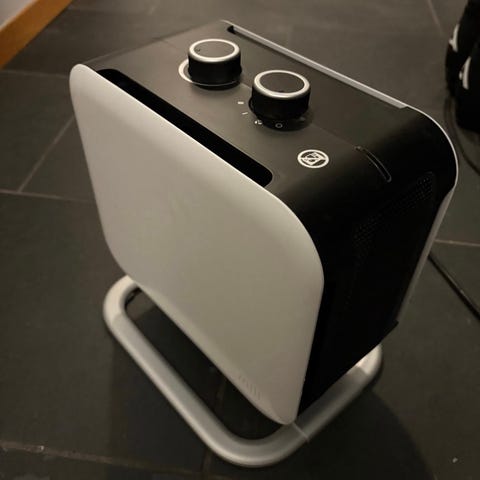 Optiov varmevifte i hvit plast. Modellen er en kompakt elektrisk bord- eller gulvmodell med bærehåndtak, frontutblås og toppmontert luftinntak. Viften har to dreieknapper på toppen for innstilling av effekt og temperatur, samt indikatorlampe. Enheten har gummiføtter under for stabil plassering og leveres med fastmontert strømkabel med støpsel.