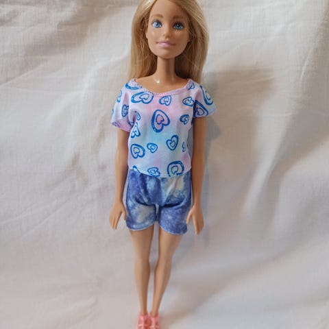 Barbie dukke med utskiftbare klær og små tilbehør. Dukken har bevegelige armer og ben. Medfølgende klær er en rosa og hvit kjole med hjerteprint og et par lilla bukser. I tillegg følger det med to små plastkopper i blått og gult/grønt. Passer til lek med andre Barbie-dukker og tilbehør i samme størrelse.litt knekt ved siden av armen men ellers helt fin.